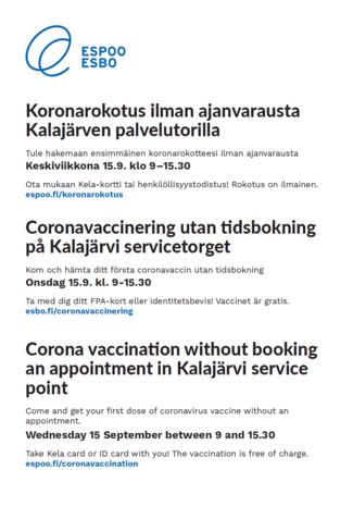 Tule hakemaan ensimmäinen koronarokotteesi ilman ajanvarausta. Ota mukaan Kela-kortti tai henkilöllisyystodistus! Rokotus on ilmainen.