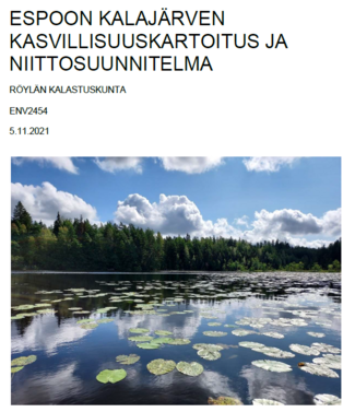 Espoon Röylän Kalastuskunta ry teetätti kesällä 2021 laajan järvitutkimuksen, jonka tarkoituksena oli selvittää miksi Kalajärvessä on viime vuosina esiintynyt selkeästi enemmän kasvillisuutta ja mitä toimenpiteitä tilanne voisi vaatia. Röylän kalastuskunnan jäsenet ovat pääosin Kalajärven ympäristön kiinteistöjä, joiden keskuudessa järven kasvillisuuden runsastuminen on herättänyt huolta ja erilaista toimeliaisuutta oman järven puhtaana pitämiseksi. Myös tulevat Kalajärven kallioiden rakentamishankkeen vaikutukset ovat tuoneet oman lisänsä järven kestokyvyn ja tilanteen selvittämiseksi.
